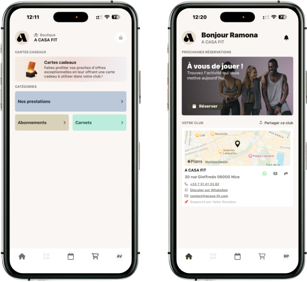 Restez connecté à A CASA FIT grâce à notre application, disponible sur l’App Store et Google Play. Connectez-vous avec votre compte personnel pour réserver vos séances, acheter vos abonnements ou cartes de séances et consulter le planning en toute simplicité.